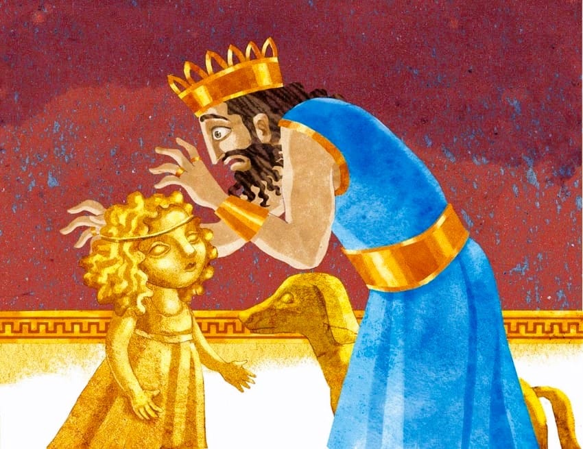 Hace muchos siglos, gobernaba en Frigia un rey llamado Midas. Este rey tenía mucho más de lo que cualquier hombre pudiera desear. Vivía en un espléndido palacio cuyo mármol brillaba como una joya a la luz del sol y sus jardines de rosales eran los más hermosos de toda la región. Sin embargo, no apreciaba lo que tenía.