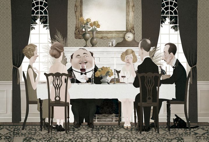 Hizo otra pausa, cogió la copa y mantuvo el borde contra su labio inferior, ese labio suyo, flácido y colgante. Entonces vi su lengua, rosada y estrecha, salir disparada, sumergir la punta en el vino y retirarse de nuevo rápidamente… una visión repulsiva. Cuando dejó la copa, mantuvo los ojos cerrados y el rostro concentrado, moviendo únicamente los labios, frotándolos como dos trozos de húmeda y esponjosa goma.