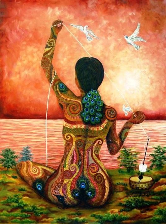 Pero si durante muchos días el viento y el frío peleaban con las hojas y espantaban los pájaros, bastaba con que la joven tejiera con sus bellos hilos dorados para que el sol volviera a apaciguar a la naturaleza.